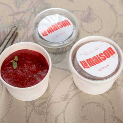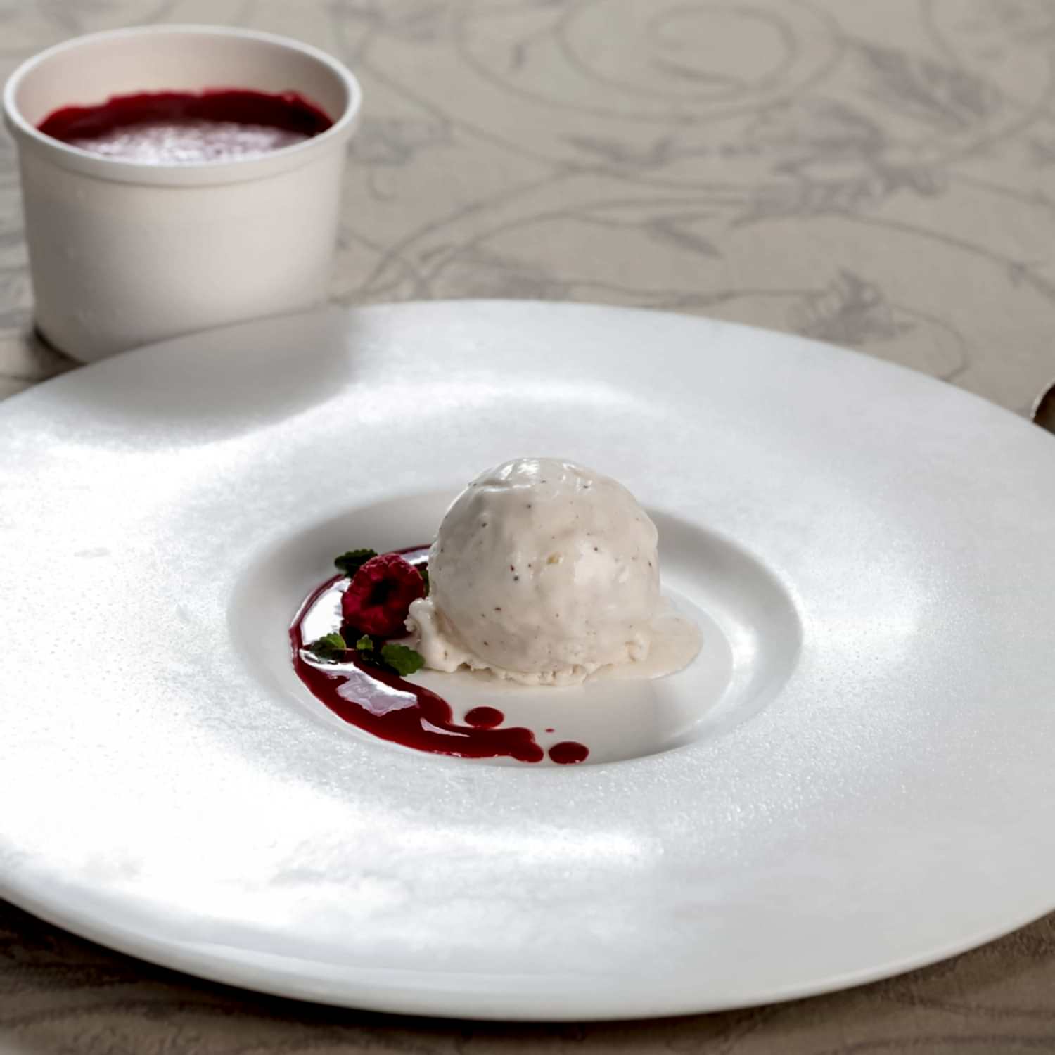 Традиционный Pin-Up десерт из ванильного мороженого с малиновым соусом